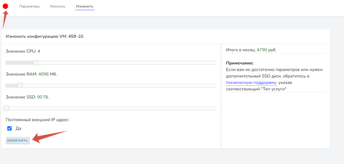 - Если параметры VM были изменены, при первом запуске с баланса будет списана дневная сумма.