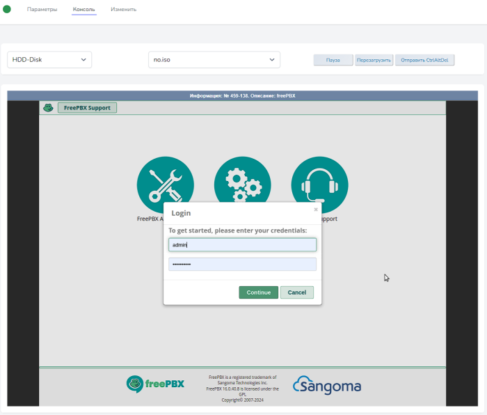 Далее нажмите FreePBX Adminstrator вам предложат зарегистрироваться (рисунок №2), введите имя пользователя и пароль ранее установленные в форме регистрации.