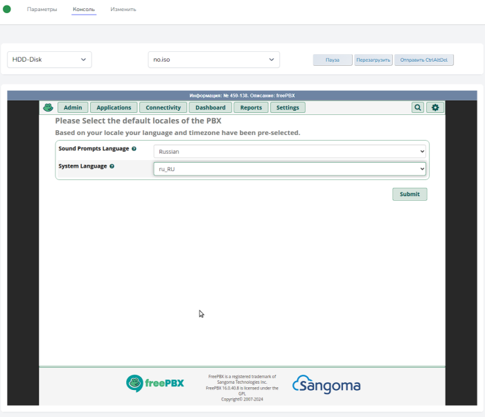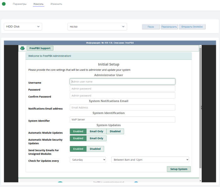В целях безопасности телефонной связи, мы не рекомендуем назначать внешний IP адрес для FreePBX. Для регистрации телефонных аппаратов на АТС использовать VPN подключения или проброс портов для ограниченного количества сетей, например для сети офиса, а для регистрации транков использовать NAT. Первичные настройки после установки можно сделать через «Консоль» в Панели управления. На рисунки №1 стартовая страница настроек заполните и нажмите «Setup System».