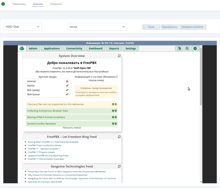 Первоначальная настройка завершена. Обратите внимания на рисунке №4 в краткой сводки, на против Asterisk стоит ! знак, это означает что система тестирует Asterisk в течении 10 минут, по истечению этого время ! знак исчезнет, если не исчез значит что то пошло не так и нужно обратиться в техническую поддержку.