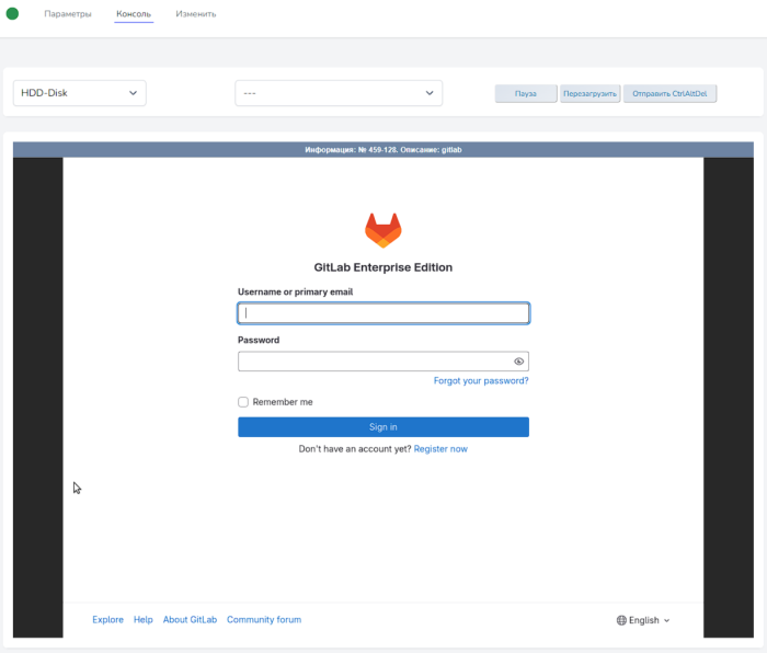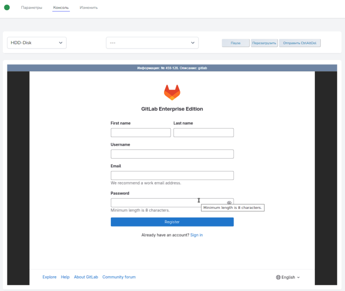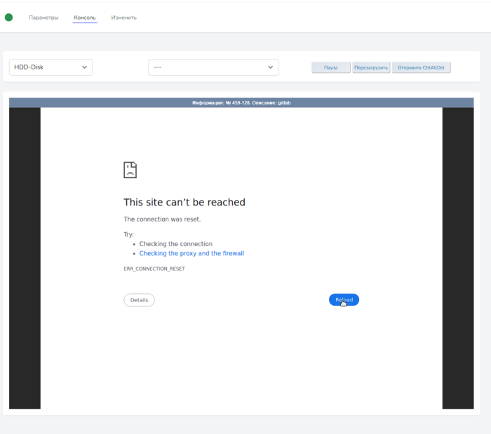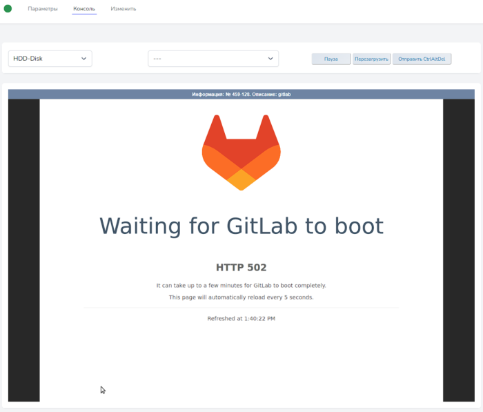 GitLab загружается не быстро, в первую очередь запускаются модули программы и в последнюю очередь web интерфейс управления. По этой причине после запуска системы вы увидите ошибку на странице управления (рисунок №1). Нужно подождать и переодически нажимать «Reload»